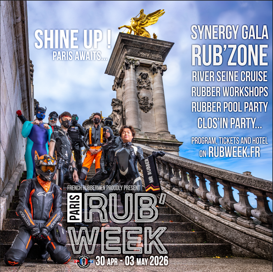 Pour la troisième fois FRENCH RUBBERMEN a organisé, le 25 mars 2023 à Paris, une soirée exceptionnelle destinée exclusivement aux mecs en latex : la RUB’ZONE… un monde souterrain où les RUBBERMEN ont pu se retrouver dans une ambiance lounge avec une zone « Drink and Dance », le DJ Florian Moginski en live toute la nuit et de nombreux espaces plus sexe dédiés aux jeux BDSM.